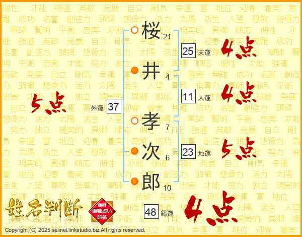 桜(21画)井(4画) 孝(7画)次(6画)郎(10画)