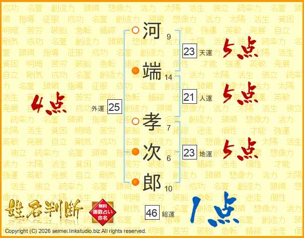 河端孝次郎さんの天運は23画の5点!