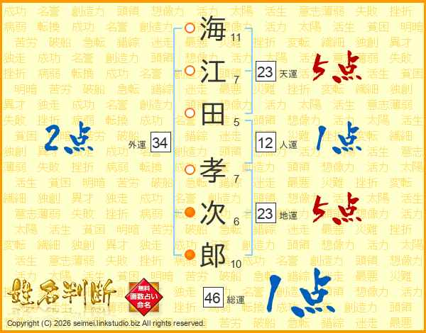 海(11画)江(7画)田(5画) 孝(7画)次(6画)郎(10画)