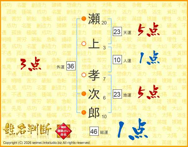 瀬(20画)上(3画) 孝(7画)次(6画)郎(10画)