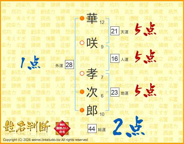 華(12画)咲(9画) 孝(7画)次(6画)郎(10画)
