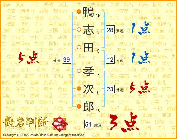鴨(16画)志(7画)田(5画) 孝(7画)次(6画)郎(10画)