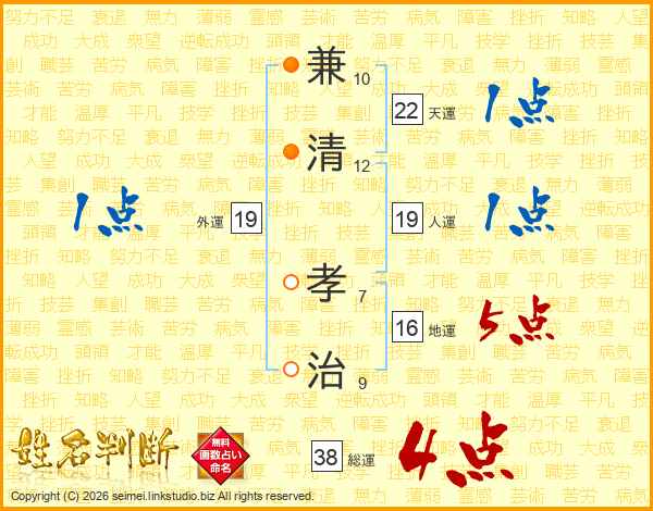 兼清孝治さんの総運は38画の4点!