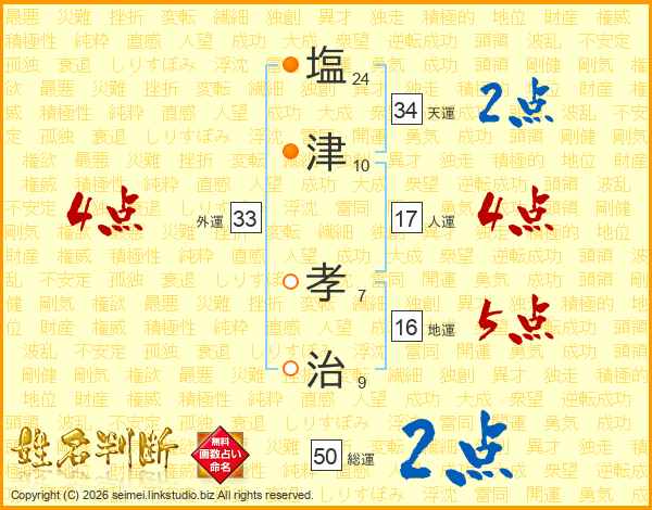 あなたの人生を表す1番重要な運勢です。生涯を通じて影響する総合運となり、主に50歳以降の晩年期に影響を及ぼします。苗字と名前の合計画数。