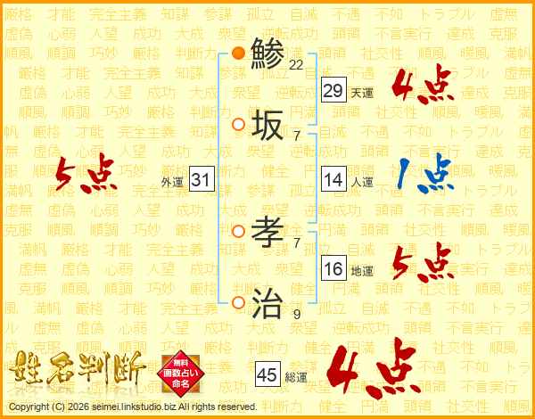 鯵(22画)坂(7画) 孝(7画)治(9画)