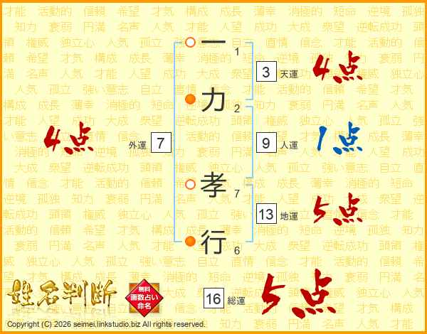 あなたの人生を表す1番重要な運勢です。生涯を通じて影響する総合運となり、主に50歳以降の晩年期に影響を及ぼします。苗字と名前の合計画数。