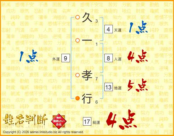 生活面を象徴する運勢です。外部から受ける影響力を表し、結婚運、家庭運や職場、環境への順応性を表します。総運から人運を引いた画数。姓や名が1文字の場合を除く。