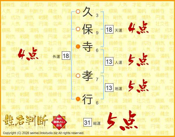 久(3画)保(9画)寺(6画) 孝(7画)行(6画)