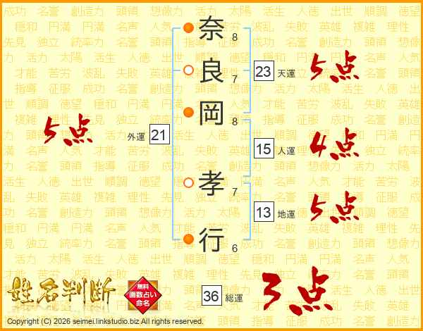 奈(8画)良(7画)岡(8画) 孝(7画)行(6画)