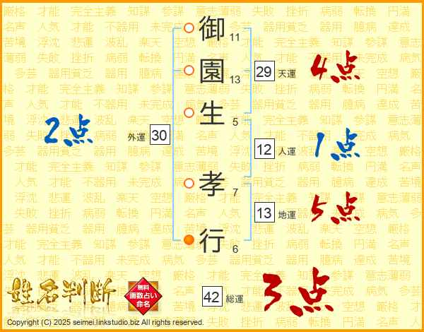 御(11画)園(13画)生(5画) 孝(7画)行(6画)