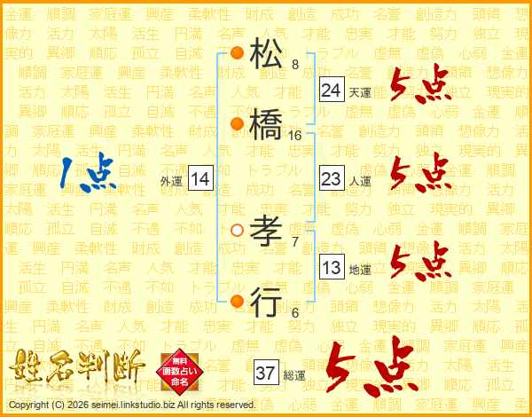 あなたの人生を表す1番重要な運勢です。生涯を通じて影響する総合運となり、主に50歳以降の晩年期に影響を及ぼします。苗字と名前の合計画数。
