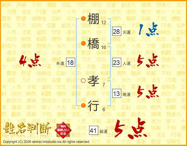 棚橋孝行さんの総運は41画の5点!