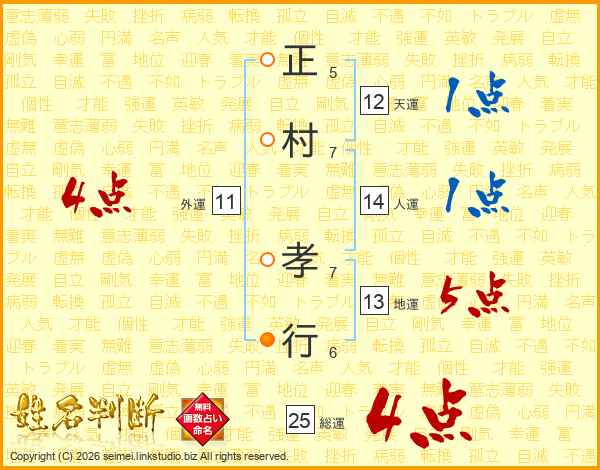 正(5画)村(7画) 孝(7画)行(6画)