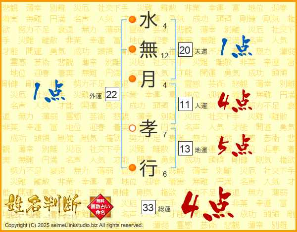 水(4画)無(12画)月(4画) 孝(7画)行(6画)