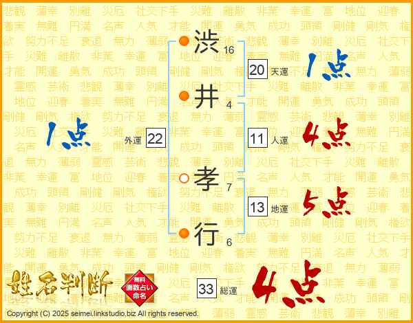 あなたの人生を表す1番重要な運勢です。生涯を通じて影響する総合運となり、主に50歳以降の晩年期に影響を及ぼします。苗字と名前の合計画数。