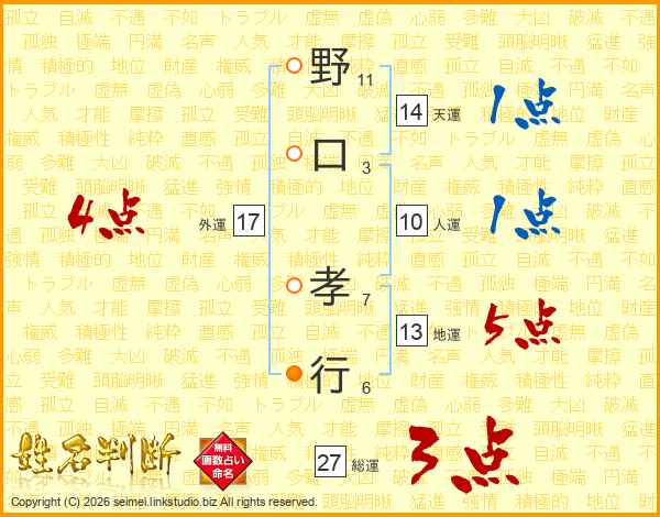 野(11画)口(3画) 孝(7画)行(6画)