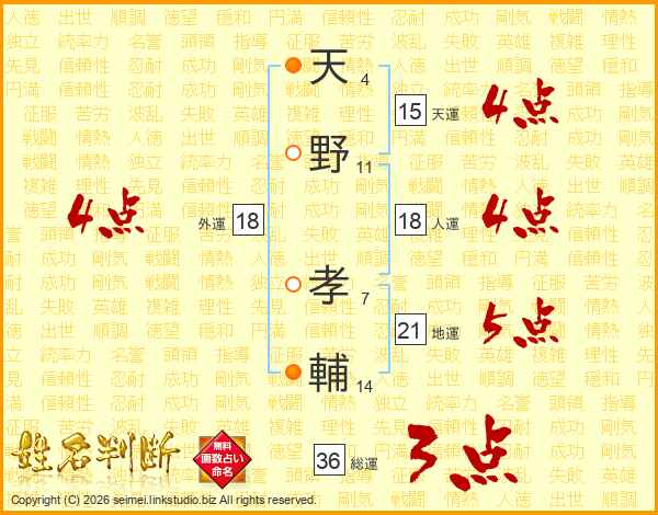 あなたの人生を表す1番重要な運勢です。生涯を通じて影響する総合運となり、主に50歳以降の晩年期に影響を及ぼします。苗字と名前の合計画数。