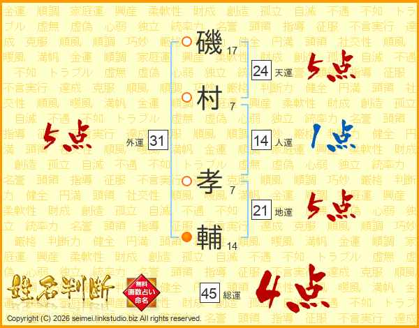 磯(17画)村(7画) 孝(7画)輔(14画)
