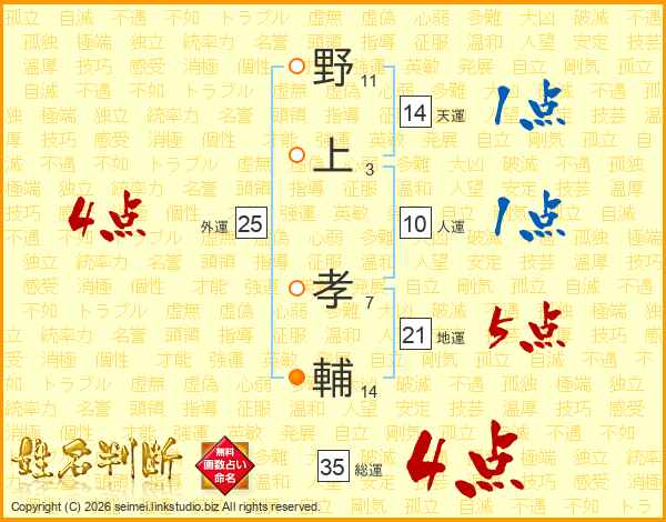 生活面を象徴する運勢です。外部から受ける影響力を表し、結婚運、家庭運や職場、環境への順応性を表します。総運から人運を引いた画数。姓や名が1文字の場合を除く。