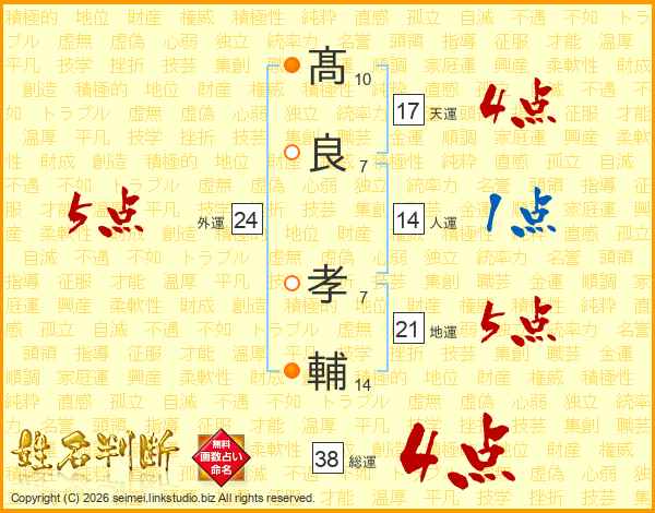髙(10画)良(7画) 孝(7画)輔(14画)
