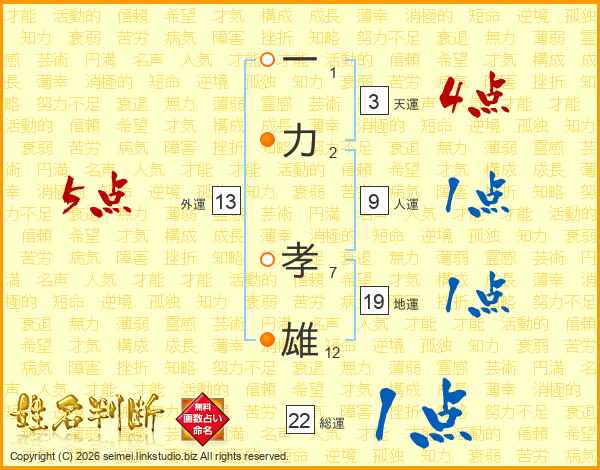 あなたの人生を表す1番重要な運勢です。生涯を通じて影響する総合運となり、主に50歳以降の晩年期に影響を及ぼします。苗字と名前の合計画数。