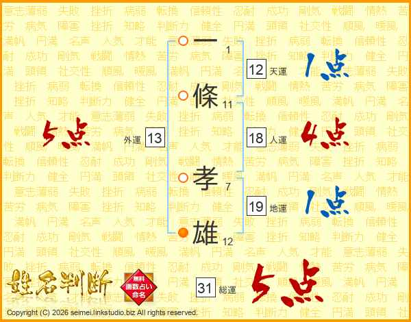 あなたの人生を表す1番重要な運勢です。生涯を通じて影響する総合運となり、主に50歳以降の晩年期に影響を及ぼします。苗字と名前の合計画数。