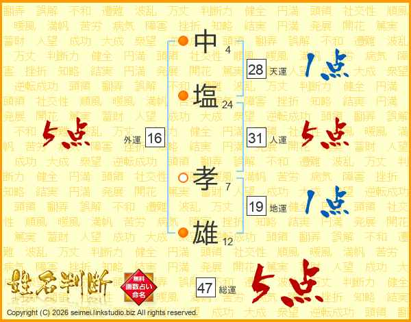 中塩孝雄さんの総運は47画の5点!