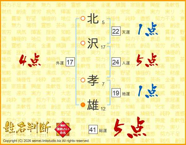 北(5画)沢(17画) 孝(7画)雄(12画)