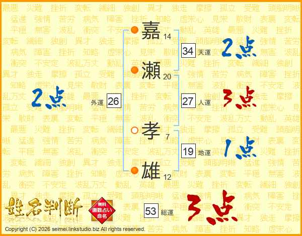 嘉瀬孝雄さんの総運は53画の3点!