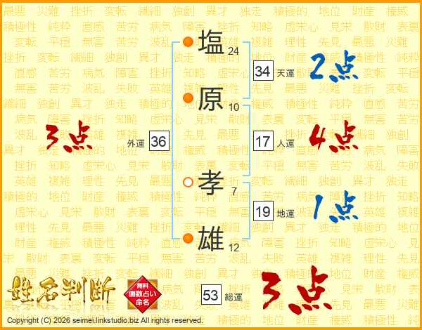 塩(24画)原(10画) 孝(7画)雄(12画)