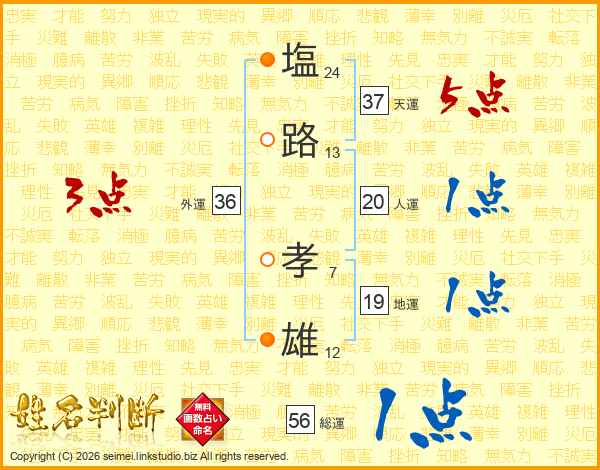 塩(24画)路(13画) 孝(7画)雄(12画)