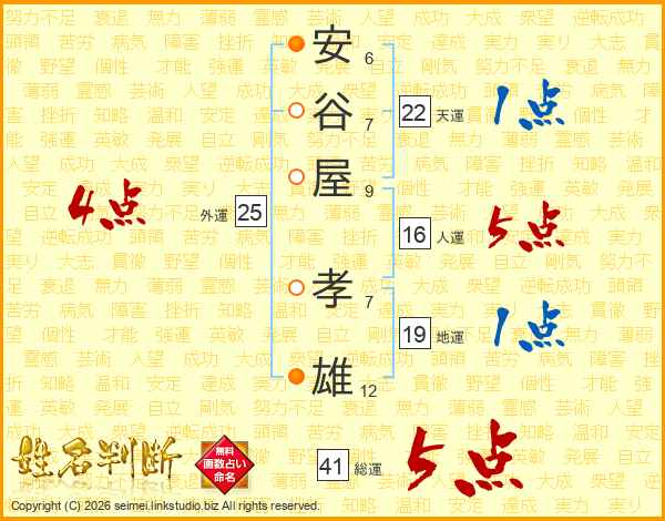 安(6画)谷(7画)屋(9画) 孝(7画)雄(12画)