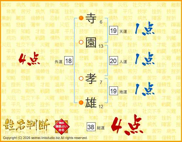 寺(6画)園(13画) 孝(7画)雄(12画)