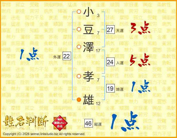 小(3画)豆(7画)澤(17画) 孝(7画)雄(12画)