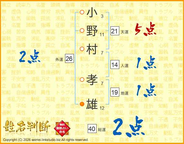 小(3画)野(11画)村(7画) 孝(7画)雄(12画)