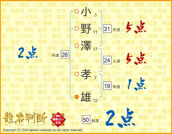 小(3画)野(11画)澤(17画) 孝(7画)雄(12画)