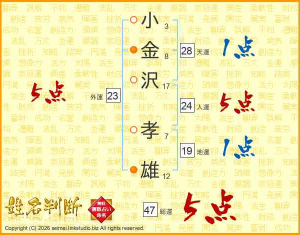 小(3画)金(8画)沢(17画) 孝(7画)雄(12画)