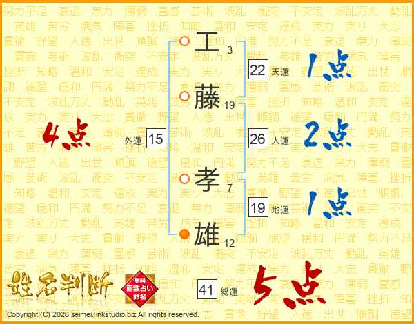 工(3画)藤(19画) 孝(7画)雄(12画)