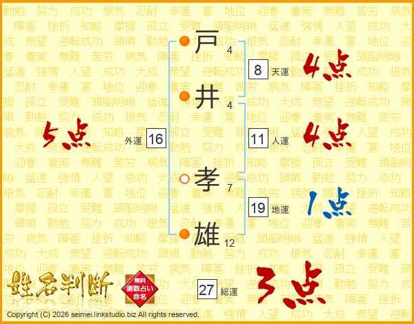 戸(4画)井(4画) 孝(7画)雄(12画)