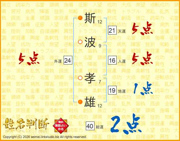 斯(12画)波(9画) 孝(7画)雄(12画)