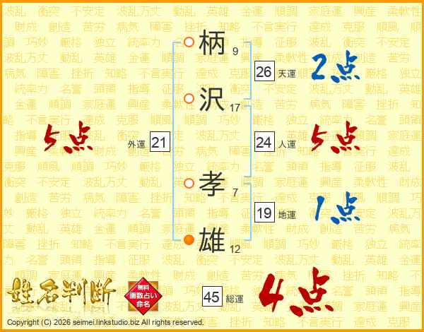柄(9画)沢(17画) 孝(7画)雄(12画)