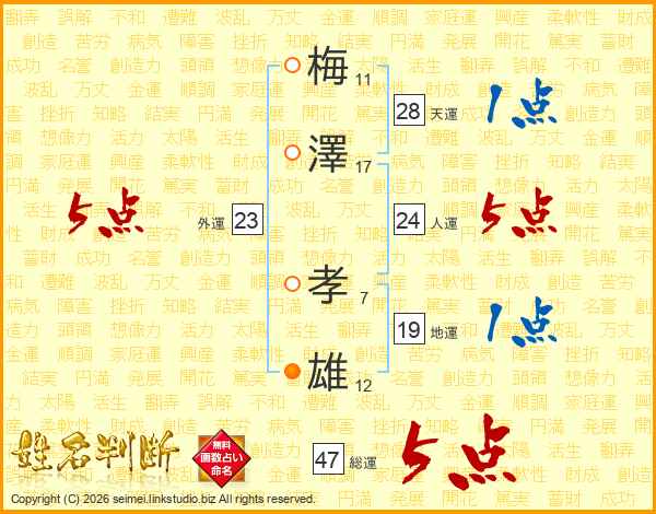 梅澤孝雄さんの総運は47画の5点!