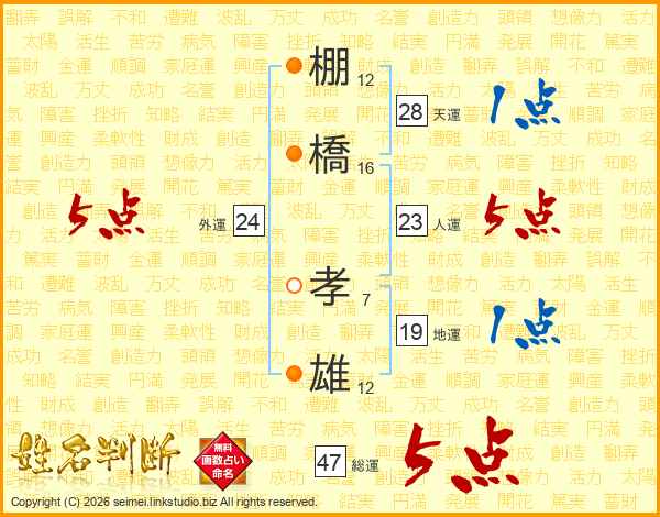 棚(12画)橋(16画) 孝(7画)雄(12画)