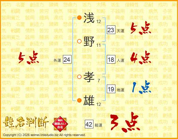 浅野孝雄さんの天運は23画の5点!