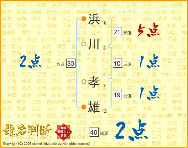 浜(18画)川(3画) 孝(7画)雄(12画)