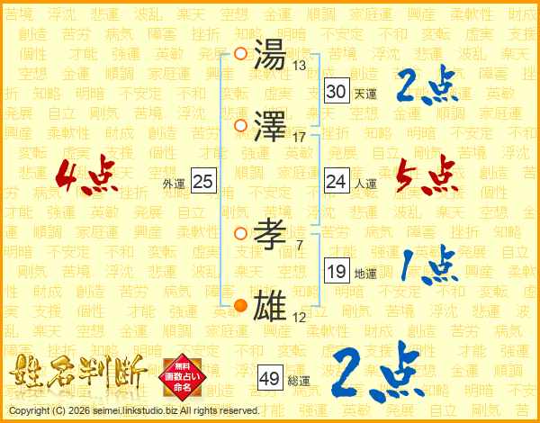 湯(13画)澤(17画) 孝(7画)雄(12画)