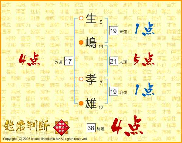 生(5画)嶋(14画) 孝(7画)雄(12画)