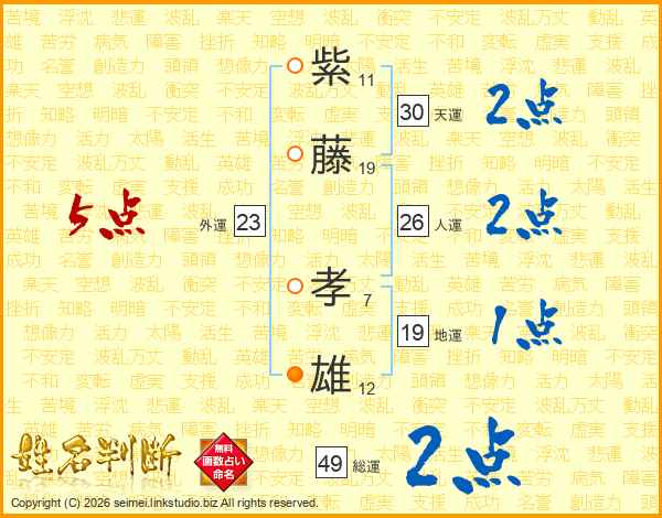 紫(11画)藤(19画) 孝(7画)雄(12画)