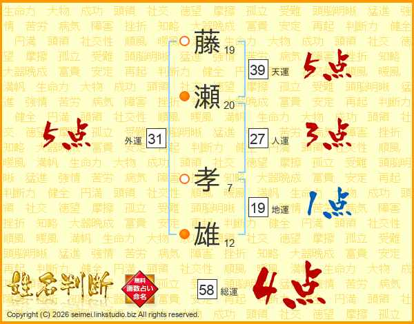 藤瀬孝雄さんの総運は58画の4点!