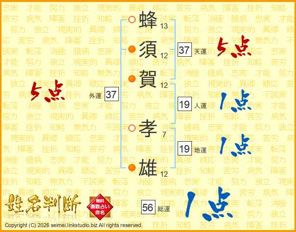蜂(13画)須(12画)賀(12画) 孝(7画)雄(12画)